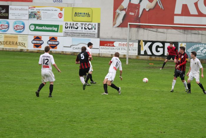 Das Spiel wurde von beiden Seiten überaus vorsichtig begonnen. Keine Mannschaft wollte etwas riskieren. Bis zur 29. Minute sah man keine einzige nennenswerte Tormöglichkeit. Das Spiel plätscherte dahin. Bei den Gnasern merkte man ob der letzten Spiele die Verunsicherung deutlich an. Da wurde der Ball mehr in die Breite und nach rückwärts gespielt, als nach vorne. Zudem wirkte die Mannschaft müde und das Spiel kam einfach nicht in die Gänge. 30. Minute: Nach einem Foul an Obendrauf bekamen die Gnaser rund 18 m vor dem gegnerischen Tor einen Freistoß zugesprochen. Der Freistoß von Matthias Schadler war gut angetragen, der Ball strich um Zentimeter am rechten Pfosten vorbei ins Torout (30.).