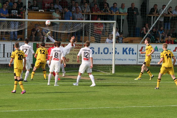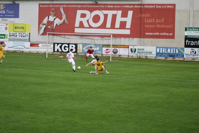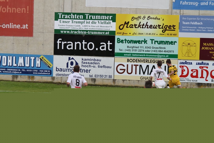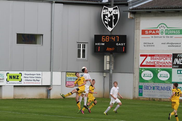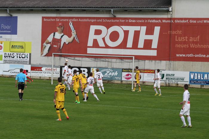 In der 48. Minute wurde der schnelle Kniewallner nach einem Zuspiel von Christoph Haas von Torhüter Schneidl im Strafraum zu Fall gebracht. Den dafür diktierten Elfer verwandelte Daniel Haas in bewährt sicherer Manier zum 1:0 für Gnas. Nach einem herrlichen Lochpass von Zimmermann zu Obendrauf konnte sich Torhüter Schneidl auszeichnen, er lenkte den Flachschuss von Obendrauf aus halblinker Position noch zur Ecke (55.). Gleich mehrere gute Möglichkeiten ergaben sich wenig später, als Obendrauf und Kniewallner hintereinander mit ihren Schüssen am Tormann bzw. an der Abwehr scheiterten (59.). Tore, die man nicht schießt...