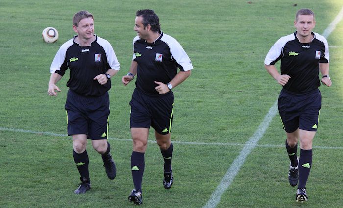 Das Schiedsrichterteam um FIFA-Referee Eisner (Mitte). Links Spörk, rechts Komornyik.