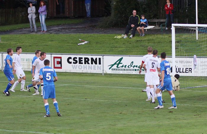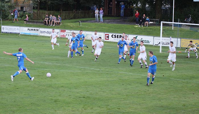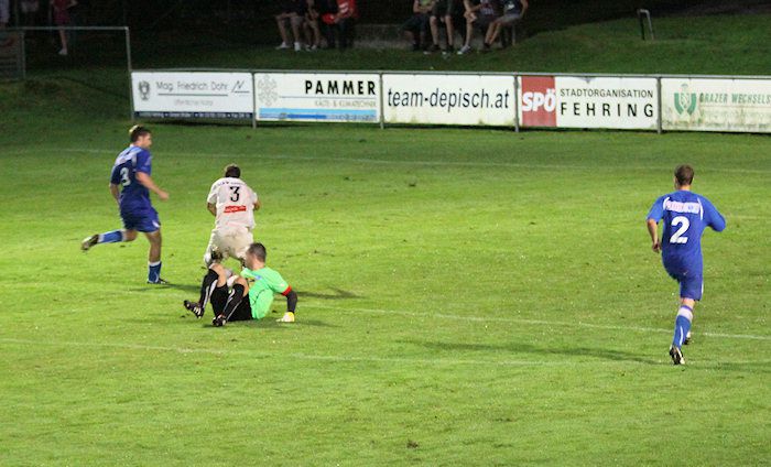 Dreißig Minuten waren gespielt, dann schlug es bei den Fehringern erstmals ein. Matthias Schadler donnerte einen Freistoß von der linken Seite in den Strafraum, Torhüter Winkler konnte den Schuss zwar abwehren, traf damit aber den Gnaser Christian Schadler, von dem das Leder, unglücklicherweise aus Sicht der Fehringer, ins Netz kollerte. 1:0 für Gnas.