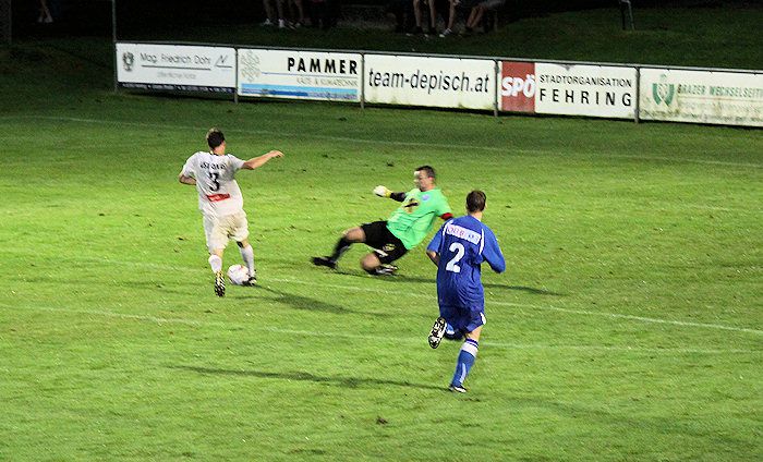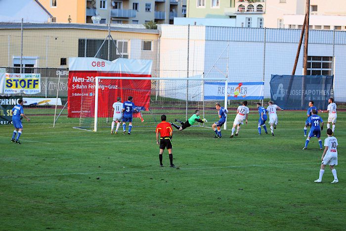 Aufregung gab es in der 79. Minute, als Kniewallner nach schönem Steilpass von M.Schadler am herausgeeilten Fehringer Schlussmann vorbei ziehen wollte und knapp außerhalb des Strafraumes von ihm gefoult wurde. Da wollten viele die Rote Karte sehen, doch SR Eisner zeigte Winkler die gelbe Karte und gab Freistoß. Und diesen von Matthias Schadler getretenen Hammer-Freistoß parierte Winkler mit Reflex.