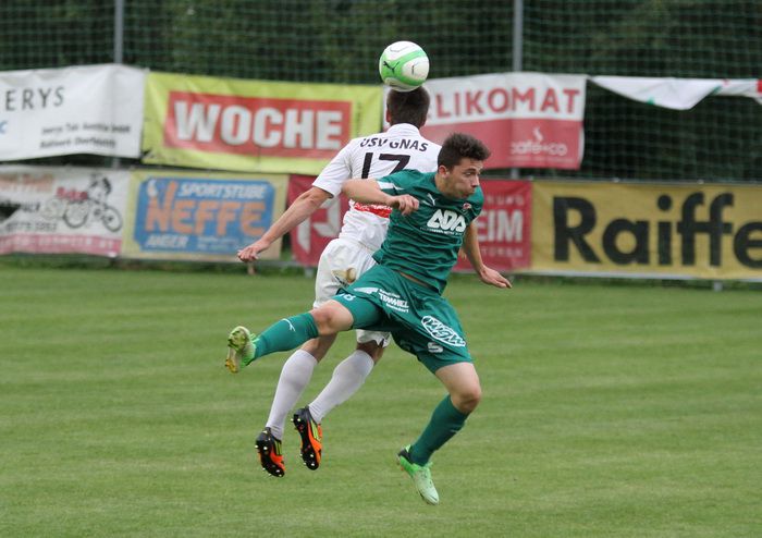 Gnas-Verteidiger Stefan Klenner (links) köpfelt einen M. Schadler-Freistoß am Tor vorbei (44.).