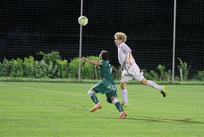Gnas-Angreifer Christian Fink köpfelt den Ball weg (rechts).