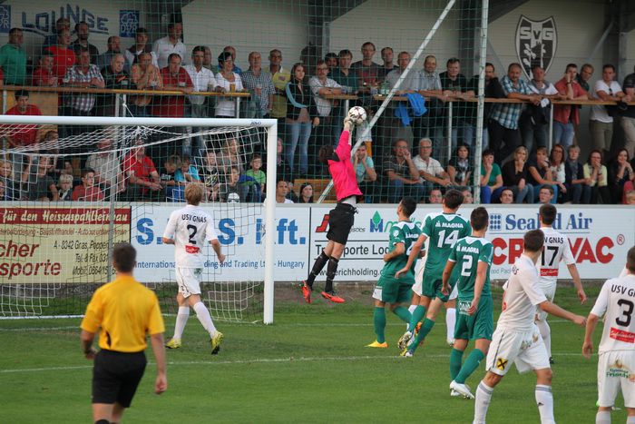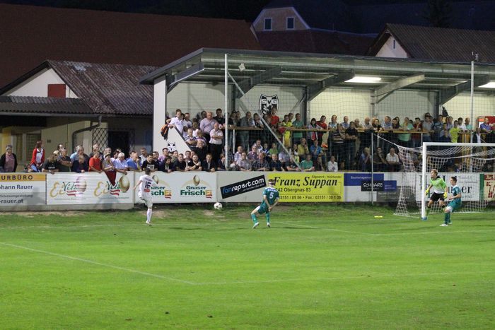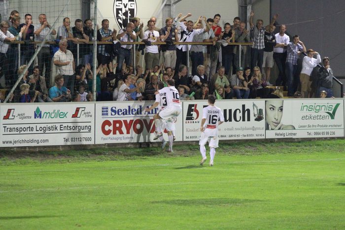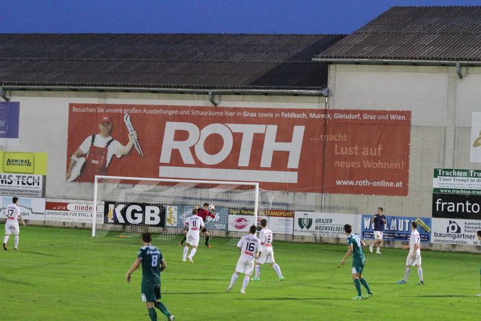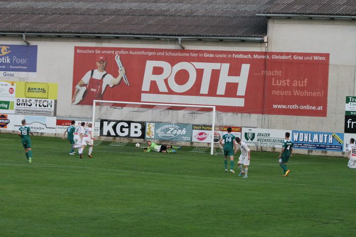 Ein mustergültiger Konter brachte die Entscheidung in der 76. Minute. Rene Obendrauf passte ideal ins Loch auf Raphael Kniewallner, der schnelle Mittelfeldspieler lief der Verteidigung davon und beförderte das Leder am herausgeeilten Torhüter Leitner vorbei ins Netz. 3:0 für den Außenseiter Gnas und Riesenjubel unter den 800 Fans!