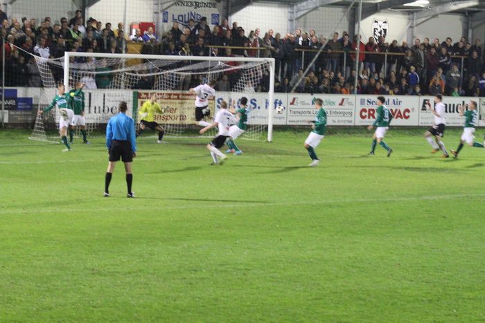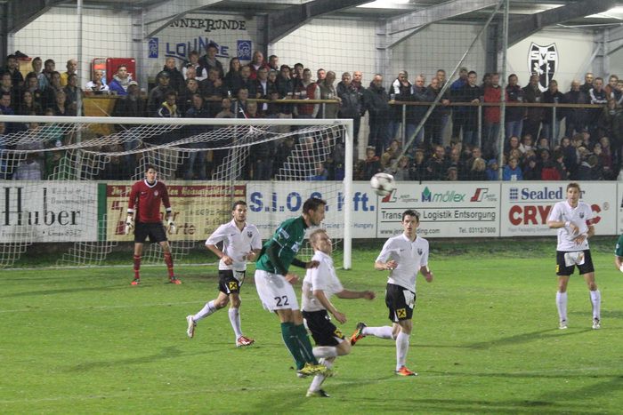 Nach einer Ecke von links verfehlt Kniewallner (Nr.3) das Leder (27.).