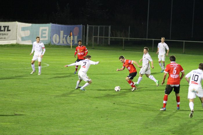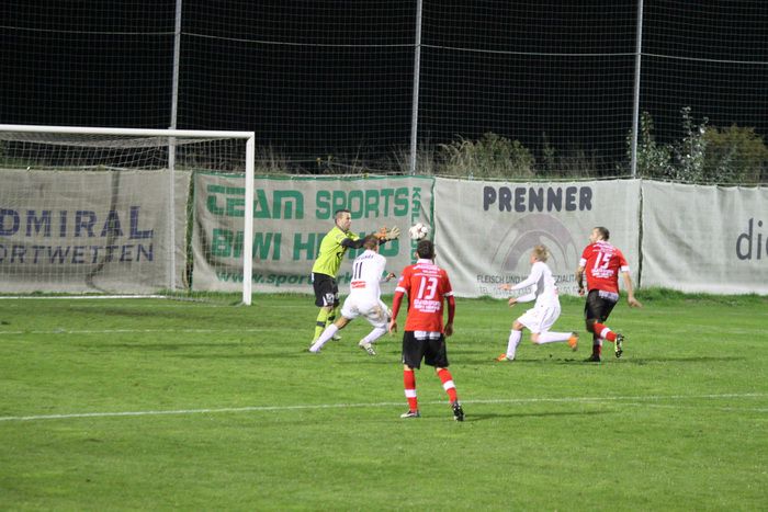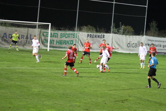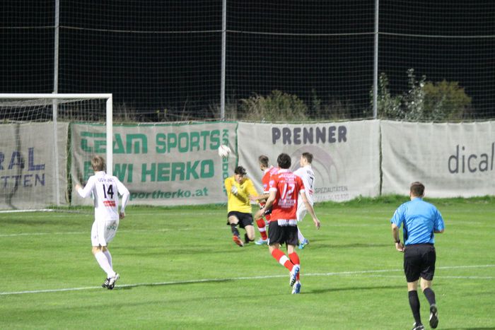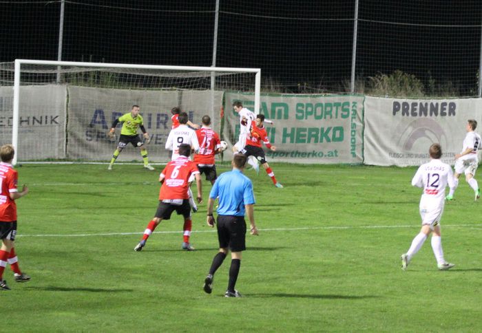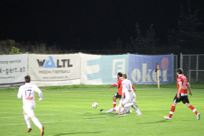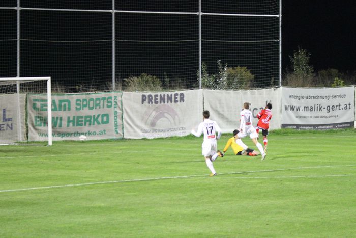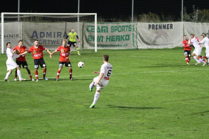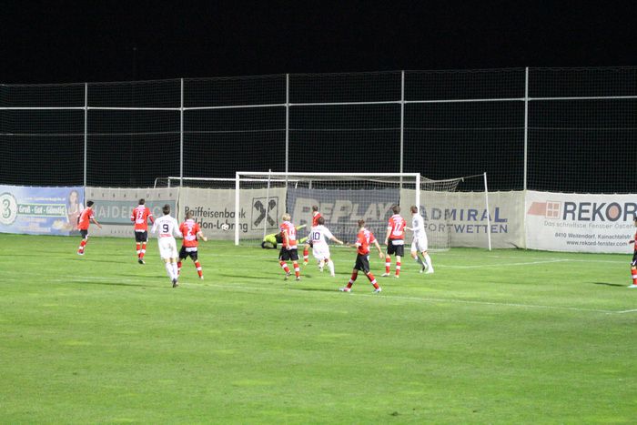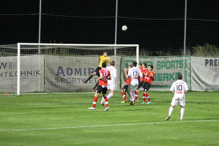 Kovacec (Nr.11) stürmt Richtung Gnaser Strafraum, trifft mit seinem Schuss Christian Schadler, wodurch der Ball abgefälscht wird und steht...