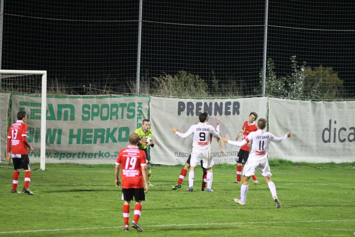 Die Hauherren legten einen Blitzstart hin und nach 90 Sekunden stand es 1:0 für ihre Mannschaft. Die Gnaser Abwehr war nach einem von Kovacec aus rund 20 m abgegebenen Schuss, der Christian Schadler traf und dabei abgefälscht wurde, nicht aufmerksam genug und so tauchte Kovacec wenige Augenblicke später vor Roth auf und überhob diesen.