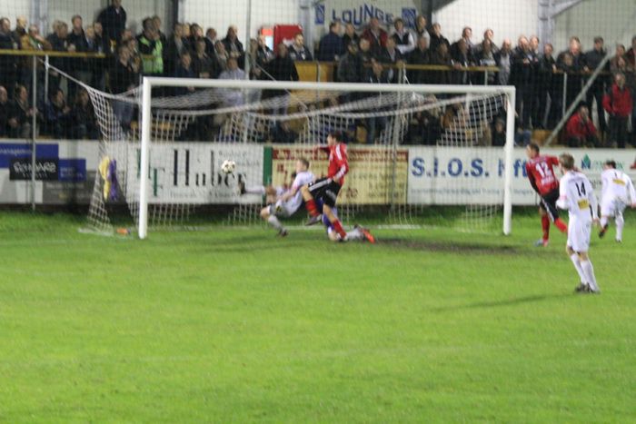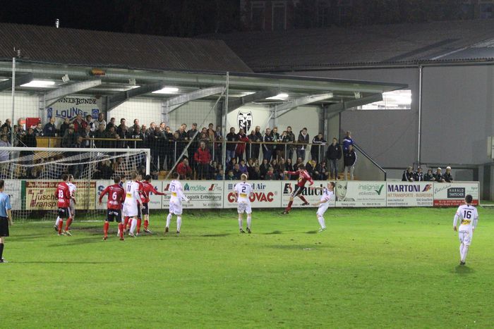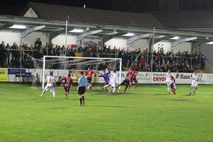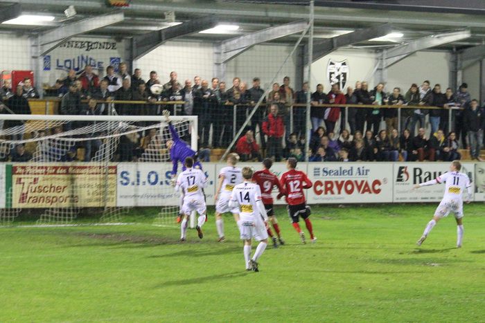 Gnas-Verteidiger Zimmermann (Nr.7) schießt aus spitzem Winkel aufs Tor...