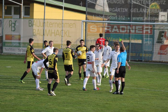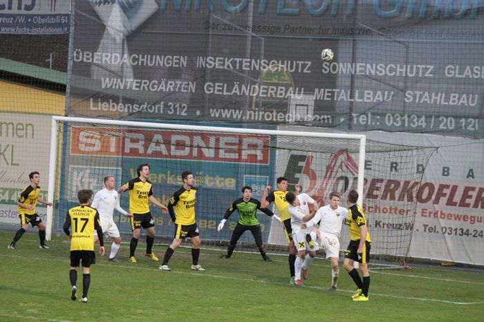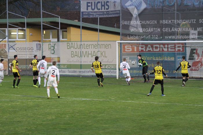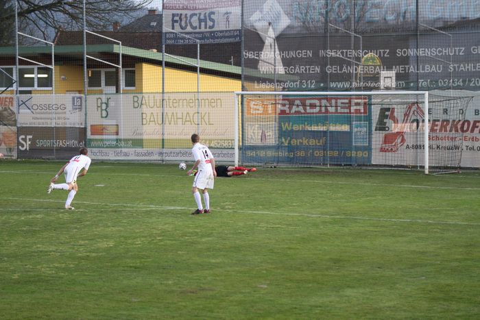 Nach einem Foul von Gnas-Kapitän Christoph Haas an Hlg.Kreuz-Zugang Bernard Suker, der durch die Reihen der Gnaser marschierte, gab SR Harrer Freistoß knapp außerhalb des Sechzehners. Suker trat selbst an und setzte den Freistoß an die Querlatte.