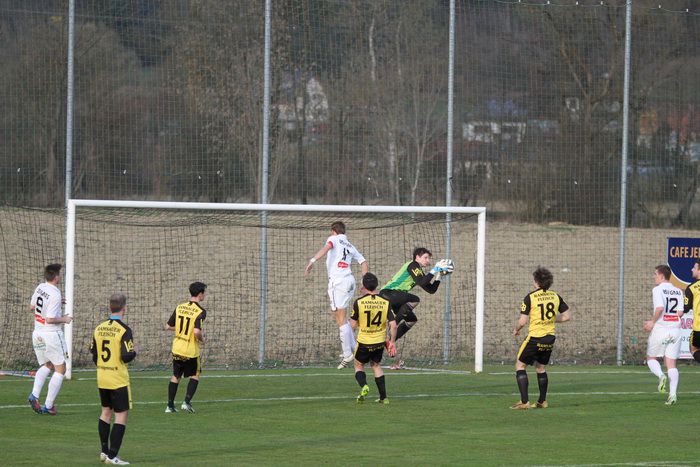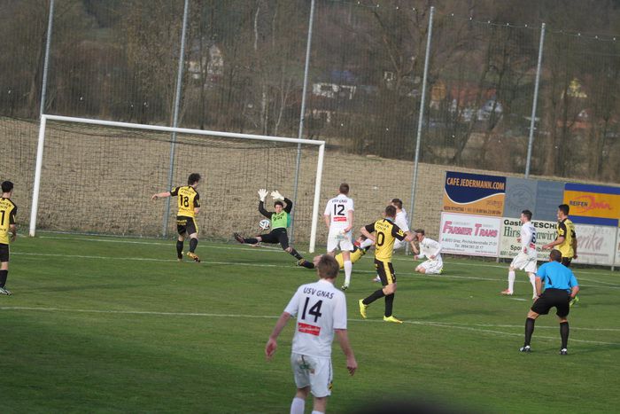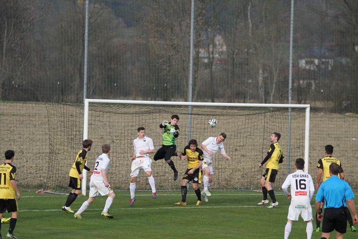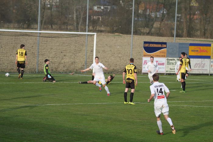 Gnas-Stürmer Rene Obendrauf versuchte sein Glück mit einem Weitschuss in der 29. Minute, traf jedoch nur ans Außennetz. Wenig später bewahrte Christoph Haas nach einem weiten Einwurf der Hausherren die Ruhe, als er in einer brenzligen Situation, eingekreist, kurz vor der Torlinie, den Ball gerade noch aus dem Gefahrenbereich befördern konnte.