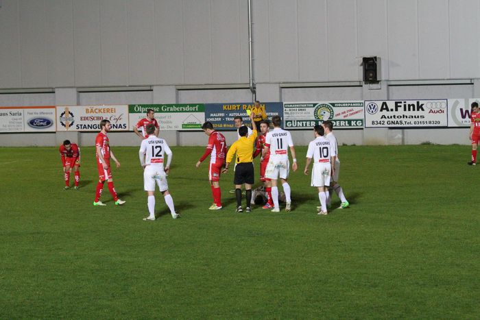 Nach einem Foulvergehen an Kniewallner musste die Nr. 2 der Gäste, Nic Hechtfisch in der 56. Minute mit der Ampelkarte vorzeitig das Feld verlassen. Die Gnaser nunmehr in der Überzahl, drängten weiter auf den Ausgleich. Lackner wurde von Ziegler gefoult, den Freistoß donnerte M. Schadler knapp am linken Pfosten vorbei (60.). Bei einem Gegenangriff war Torhüter Roth bei einem aus kurzer Distanz abgegeben, eher harmlosen Schuss von Romica-Ilie David auf dem Posten (62.).