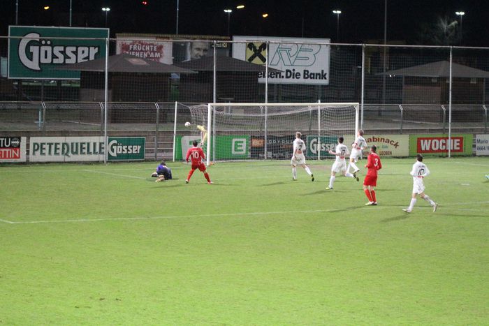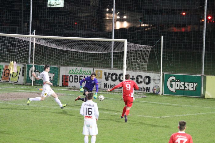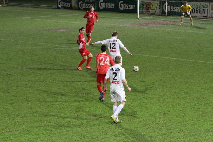 Zwei Minuten später fanden die Gnaser die nächste große Möglichkeit vor. Andreas Lackner flankte, von links kommend in den Strafraum, Raphael Kniewallner, der mitgelaufen war, setzte den Ball per Kopf knapp an der rechten Stange vorbei ins Torout. Ein wuchtiger Freistoßball von Matthias Schadler verfehlte das Tor der Hausherren ebenfalls knapp (40.) Der Ball zog links am Tor vorbei.