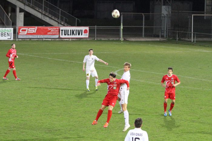 Wo ist der Ball? Gnas-Verteidiger Stefan Klenner (links) bei einem Kopfballduell.