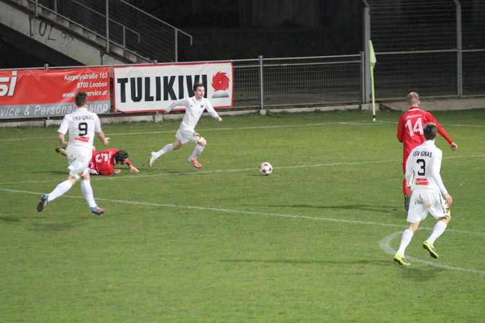 Auf der anderen Seite versuchte Kenan Ramic in der 58. Minute mit einem Volleyschuss aus 16 m den Abschluss, Keeper Roth war auf dem Posten. Ein Schuss des Gnas-Angreifers Rene Obendrauf aus rund 20 m zog über die Querlatte des Leobner Gehäuses.