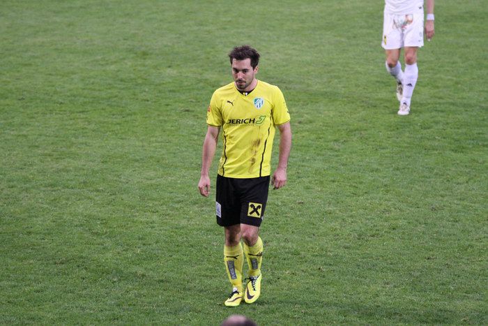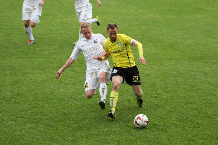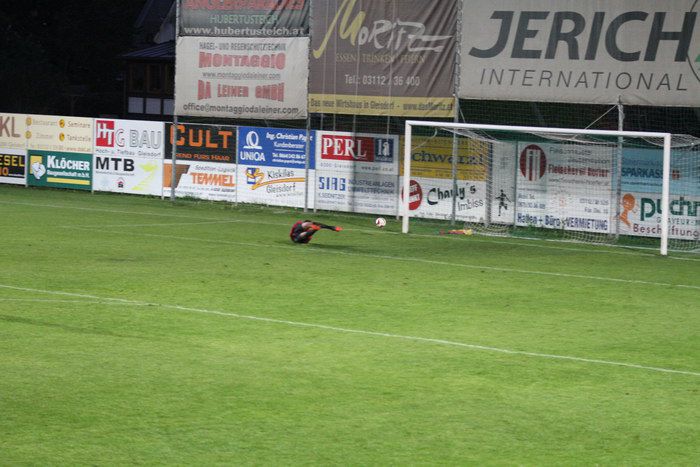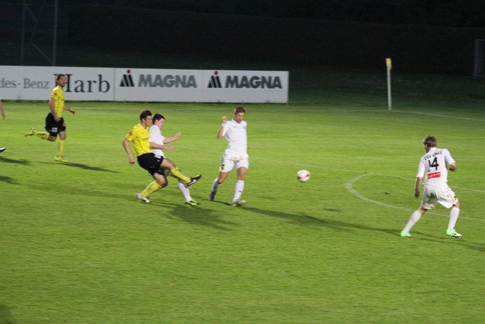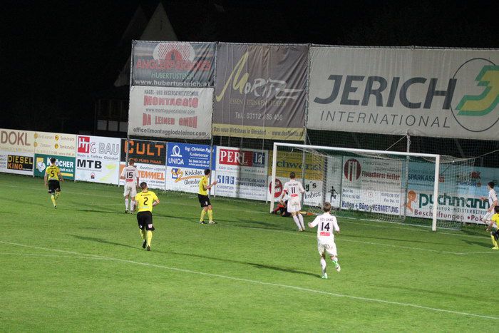 Nach einem M. Schadler-Freistoß schießt C. Fink (am Boden) am Tor von Leitner vorbei (17.).