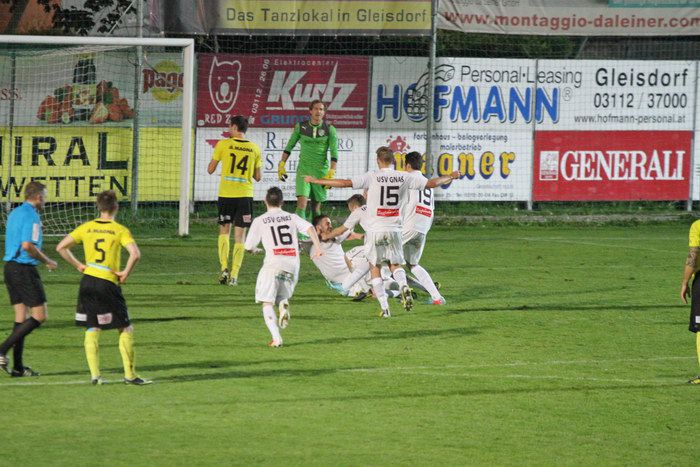 Der Dauerdruck der Gleisdorfer hatte in der 82. Minute für die Gnaser Folgen. Johannes Driesner flankte von der rechten Seite in den Strafraum, Benjamin Teuschler war aus kurzer Distanz vor Goalie Roth per Kopf zur Stelle und netzte zum 1:0 ein. Ein verdienter Führungstreffer, der längst in der Luft lag. Die Hausherren versuchten nun vehement, die endgültige Entscheidung, das 2:0 herbeizuführen, konnten aber die gut stehende Gnaser Verteidigung in der Folge nicht mehr entscheidend knacken. In der 87. Minute brachte Teuschler von der rechten Seite einen Ball in den Strafraum, wo Driesner, freistehend vor dem 2. Pfosten, den Ball links neben das Tor setzte.