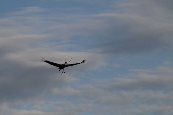 Ein großer gefiederter Zeitgenosse besorgt Holz für sein Nest.