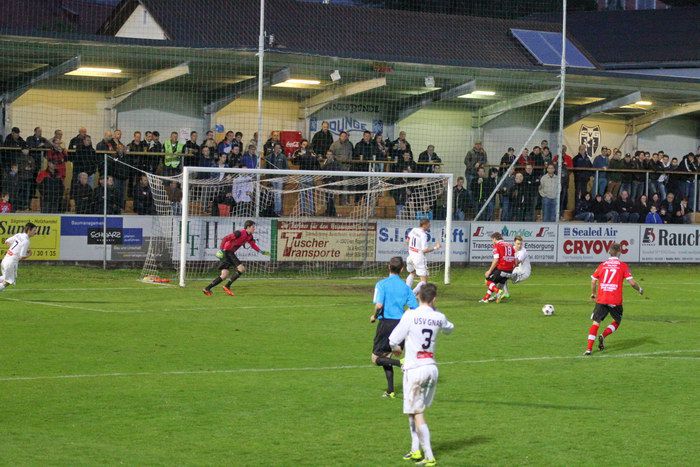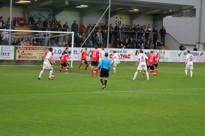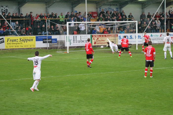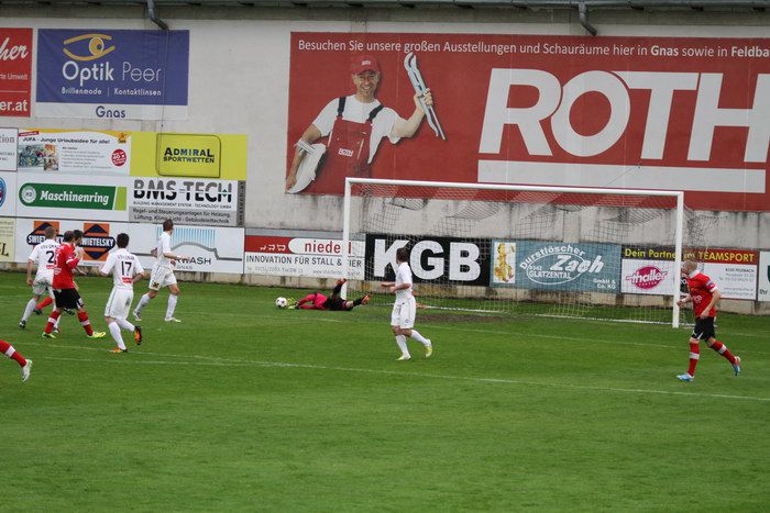 Nach einer Kniewallner-Flanke köpfelt Daniel Haas (Nr.9) aufs Tor, Goalie Gernot Lechner rettet mit Parade zur Ecke (68.).