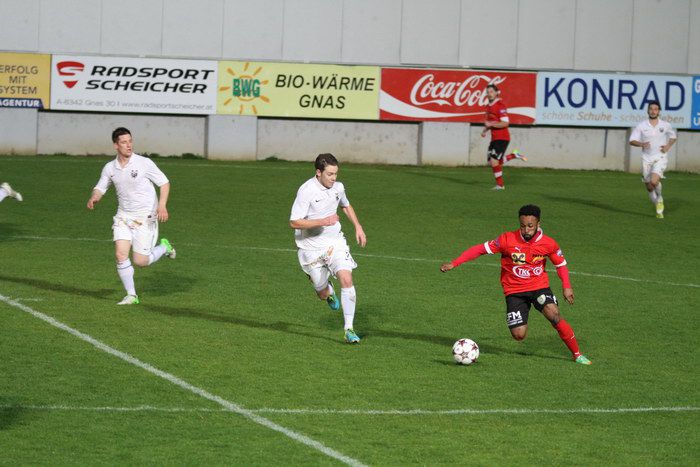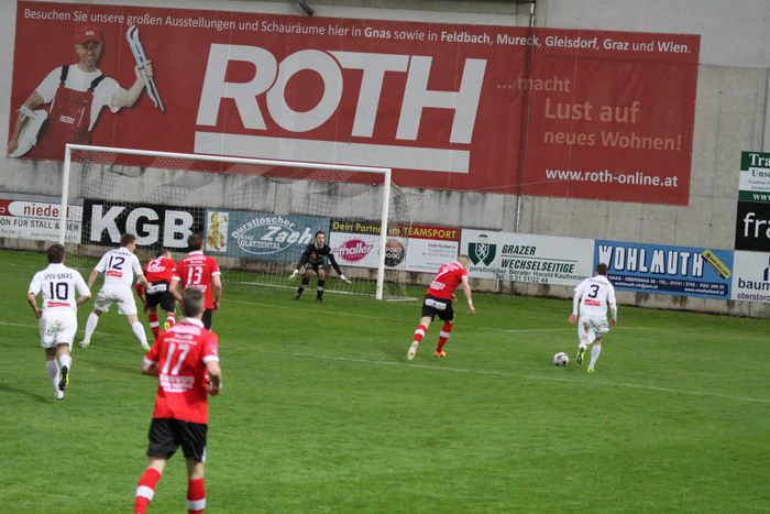 In der 14. Minute konnten die Gäste erstmals jubeln. Luka Prasnikar setzte sich auf der rechten Seite durch, brachte einen Stanglpass zur Mitte und der bei der zweiten Stange lauernde Henry Darko konnte den Ball ungehindert zum 1:0 eindrücken. Es war dies sein 2. Teffer im Laufe der Meisterschaft. Das erste Tor gelang ihm - richtig - im Herbst gegen Gnas. Die Gäste, nun beflügelt von der Führung, stürmten weiter und in der Folge musste Roth ein paar Mal eingreifen. Zuerst konnte er einen Schuss von Prasnikar zur Ecke abwehren, nach dem darauffolgenden Eckball versuchte es Moritz Langmann aus 18 m, Roth war auf dem Posten. In der 20. Minute konnte Roth einen Darko-Schuss aus 16 m halten.