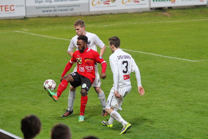 Der Torschütze zum 0:1, Henry Darko gegen Stefan Klenner (links) und Raphael Kniewallner.