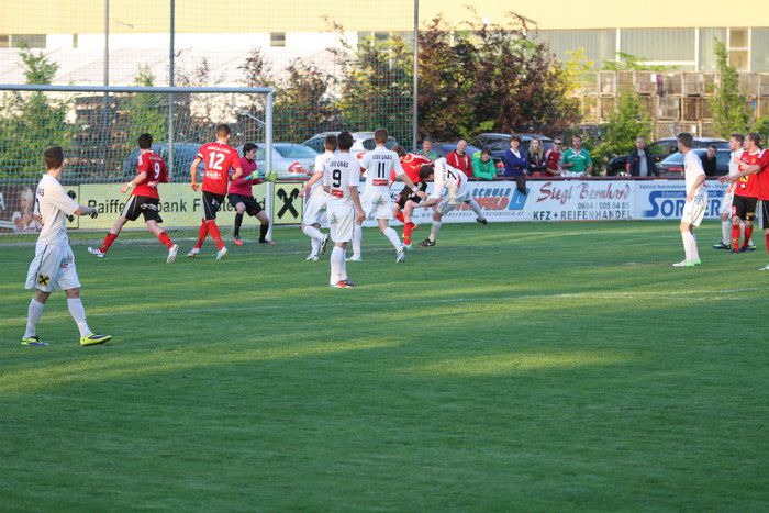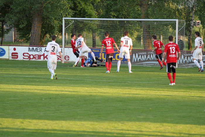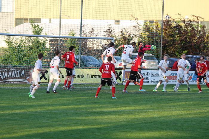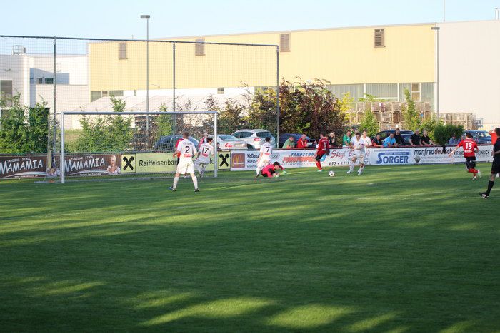 Goalie Grassmugg rettet vor Rene Obendrauf (Nr. 12) nach einem Freistoß von Matthias Schadler (44.).