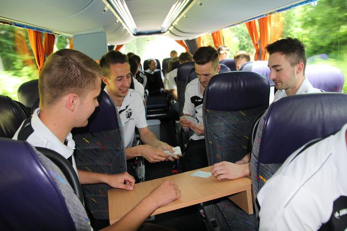 Auf der Hinfahrt wird im Bus Karten gespielt (rechts der spätere Doppelpack-Torschütze Andreas Lackner)..
