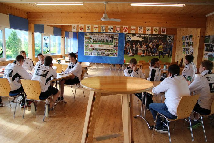 Die Gnaser in der Vereinsstube mit den Logos der Mannschaften, die ihr Trainingslager hier abgehalten haben, unter anderem Real Madrid und Borrusia Dortmund..