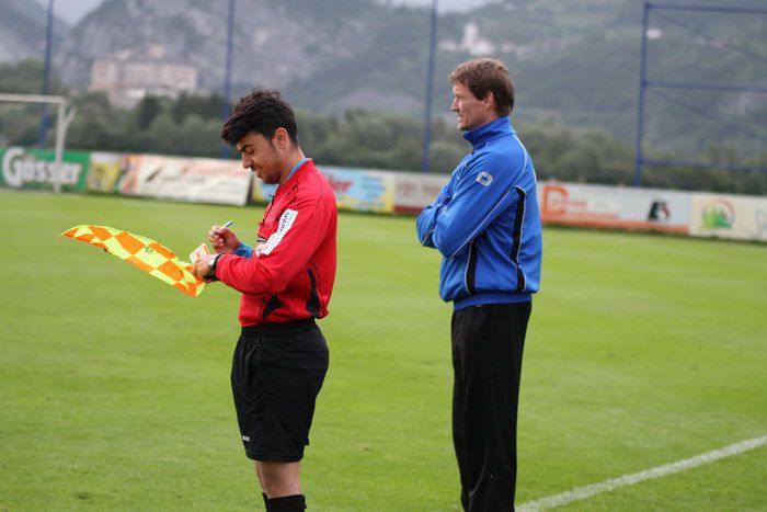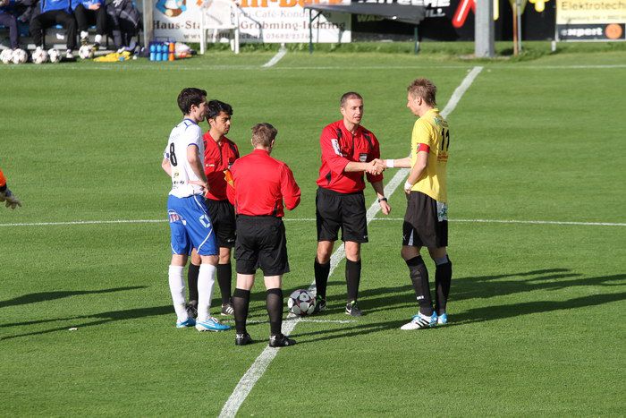 Gnas-Kapitän Christoph Haas reicht SR Komornyik die Hand.