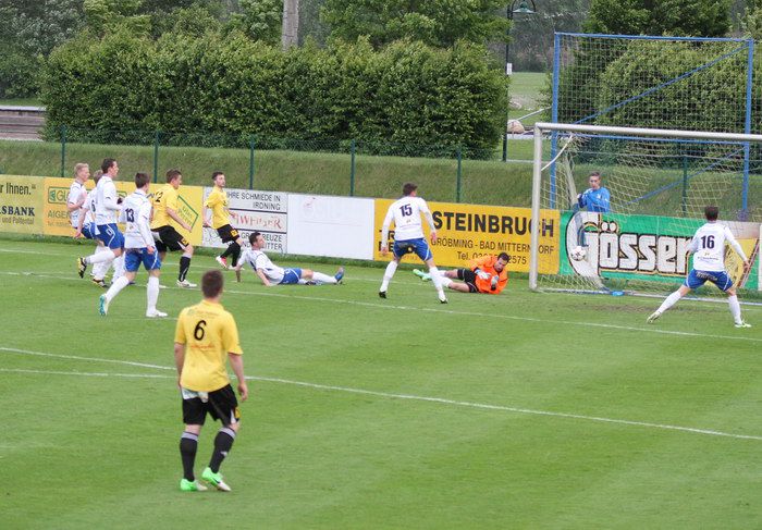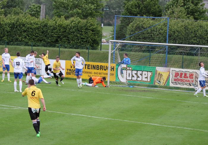 Irdning-Goalie Kropfhofer wehrt einen Lackner-Schuss aus kurzer Distanz ab (60.).