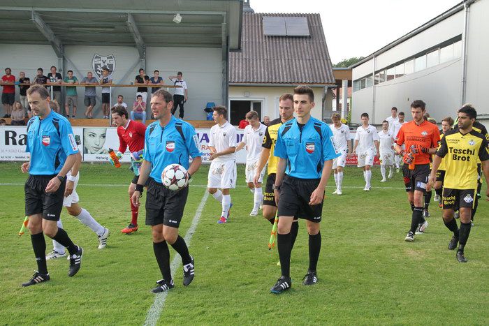 SR Kislick und seine Assistenten Omulec und Präpasser führen die Mannschaften aufs Spielfeld.