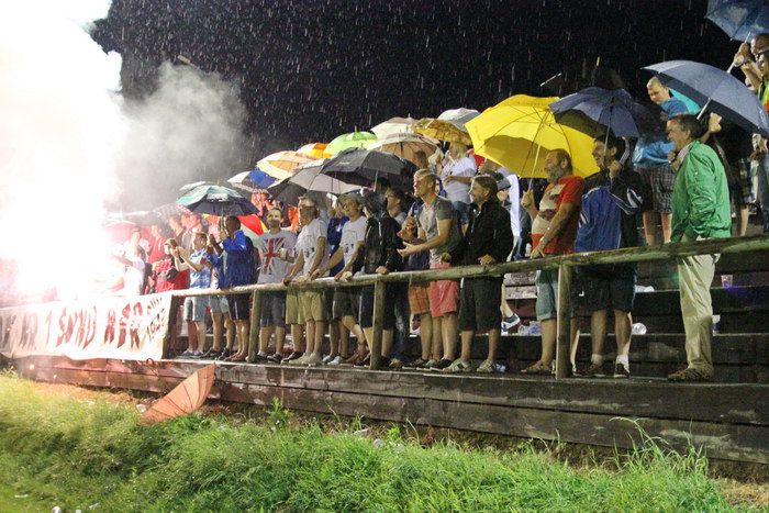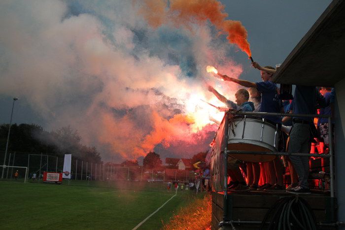 Bengalische Feuer auf dem Gnaser Fansektor nach dem Spiel.