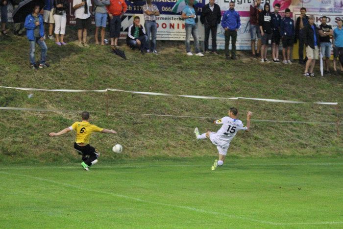 Kapitän Matthias Schadler (Nr.6) tritt den Freistoß...
