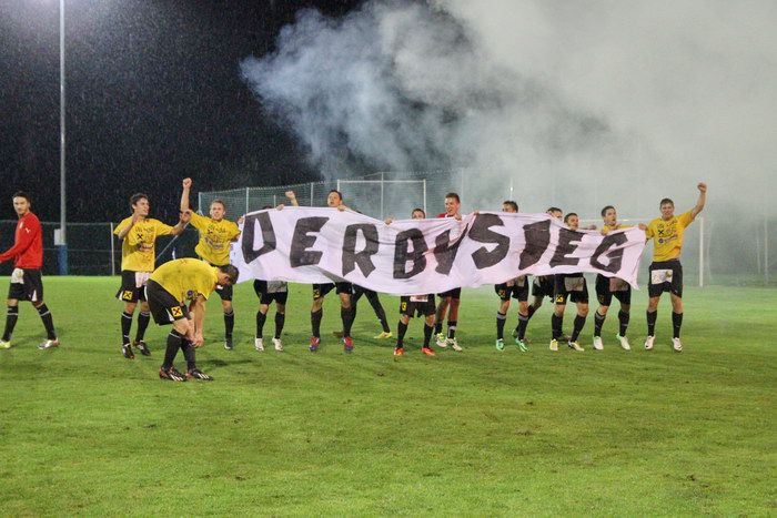 Sie zeigen das Transparent - Derbysieg - den rund 1500 Zuschauern.