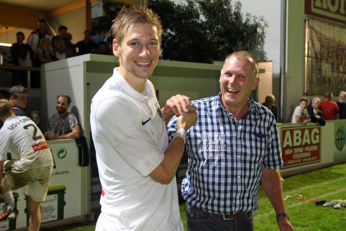 Gnas-Präsident Rudi Schwarz freut sich mit dem Kapitän über den Sieg.