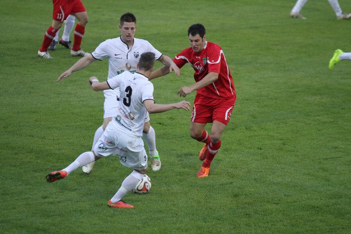 Kapitän Manfred Mandl (2.v.li) rettet nach Hereingabe von Stefan Strohmaier (nicht am Bild) vor Daniel Zimmermann (links, 26.).