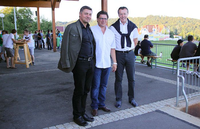 St.Anna-Bürgermeister Johannes Weidinger (mitte) begrüßte vor dem Spiel seinen Amtskollegen aus Gnas, Gerhard Meixner (links) und Gnas-Gemeinderat Ewald Roth.