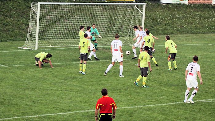 Tore, die man nicht schießt... Eine Minute später traf diese Weisheit zu. Christoph Ulrich trat einen 35 m Freistoß und zur Überraschung aller ging der Ball an "Freund und Feind" vorbei ins Tor von Alex Roth. 1:0 für die Gastgeber in der 24. Minute.