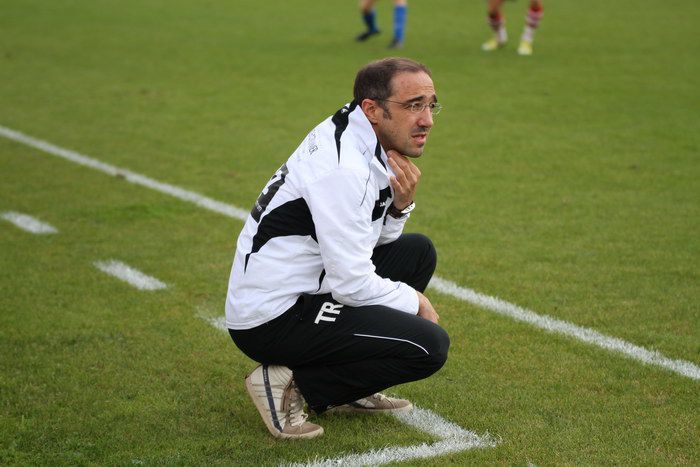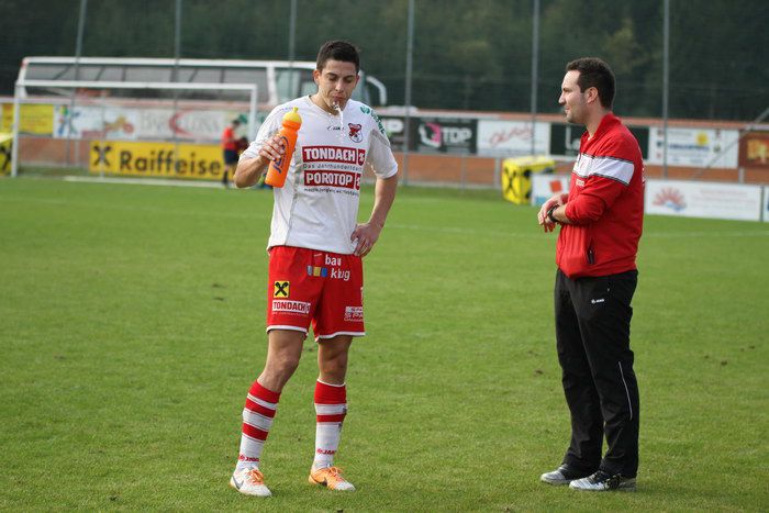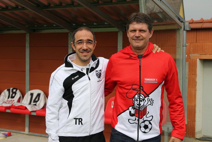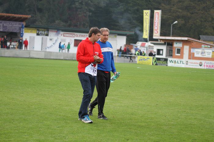 Gleinstätten-Trainer Reinmayr mit dem Tormanntrainer auf dem Weg zur Betreuerbank.