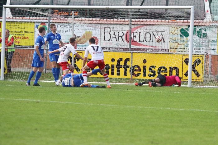Einen Kopfball von Reinegger nach Einwurf köpfelt Christoph Haas (rechts) übers eigene Tor...