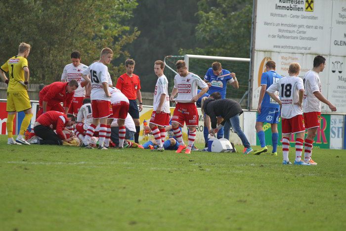 Nach einer Zimmermann-Flanke gingen der Gnaser Raphael Kniewallner und Gleinstätten-Kapitän Hannes Plieschnegger auf den hohen Ball und stießen mit dem Kopf zusammen. Beide blieben mit Platzwunden liegen und wurden am Platz erstversorgt. Mit der Rettung wurden beide ins LKH Wagna gebracht. Kniewallner konnte, nachdem die Wunde mit 4 Nähten versorgt wurde, noch am Abend die Heimfahrt antreten.