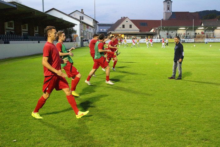 ...und Gnas-Trainer Christian Puntigam mit den Spielern beim Aufwärmtraining.