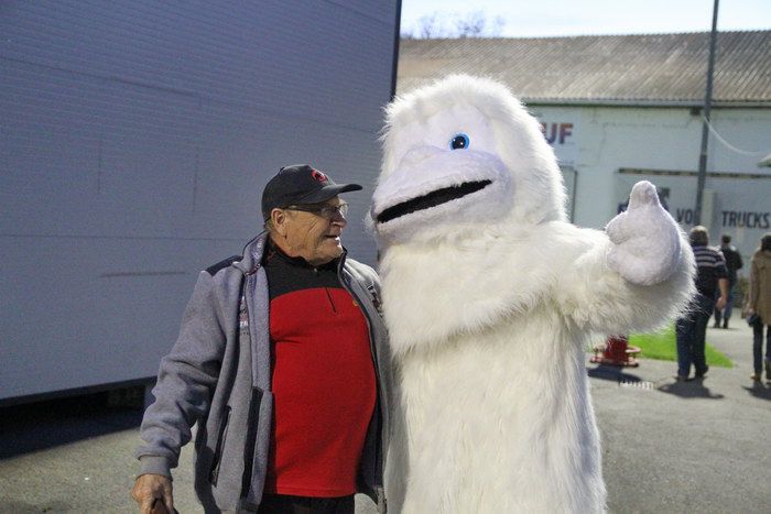 Franz Strohmaier, Opa von Gnas-Stürmer Stefan Strohmaier wird vom Yeti begrüßt.