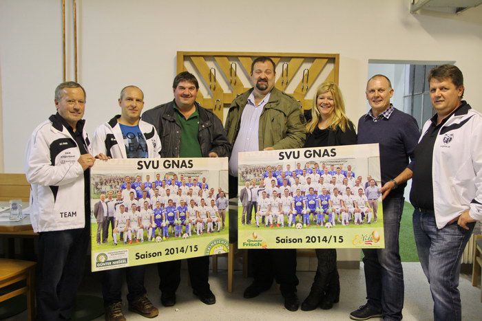 Gnas-Präsident Rudi Schwarz überreichte namens des Vorstandes an die Sponsoren Günter Niederl (3.v.links) und Alois Hütter (4.von links) mit Gattin je ein aktuelles Mannschaftsbild.