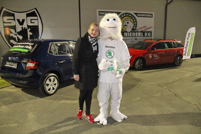 Die Gnaser Teambetreuerin Helga Reicher neben dem Fink-Yeti.