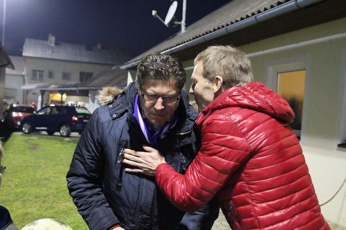 St.Anna-Trainer Alois Hödl flüstert seinem Chef, Obmann Hannes Weidinger noch schnell etwas ins Ohr.