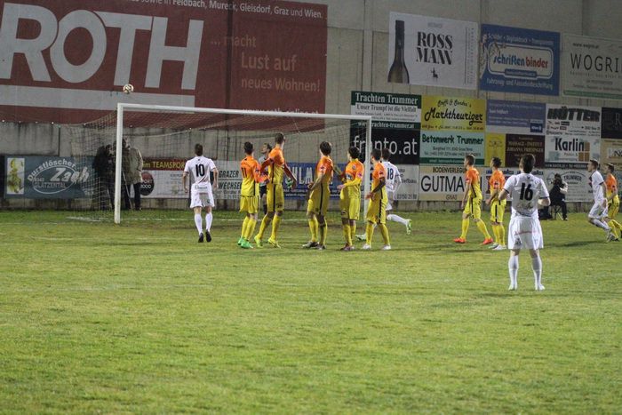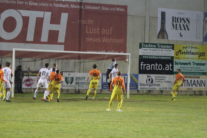 Bei einem Freistoß von Kobald von der linken Seite war Gnas-Goalie Rauch auf dem Posten (28.). Einen gefährlichen Vorstoß von Marko Guja konnte die Gnaser-Abwehr mit vereinten Kräften stoppen (35.). Auf der Gegenseite wollte Kniewallner bei einem schnellen Konterangriff der Heimischen den Gästekeeper überraschen, doch Reiter konnte den Schuss von Kniewallner zur Ecke abwehren.
