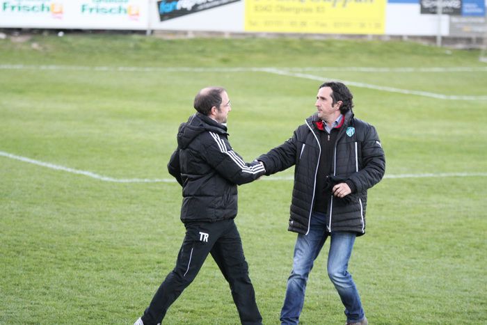 Gnas-Trainer Christian Puntigam (links) begrüßt Gleisdorf-Trainer Andreas Moriggl.