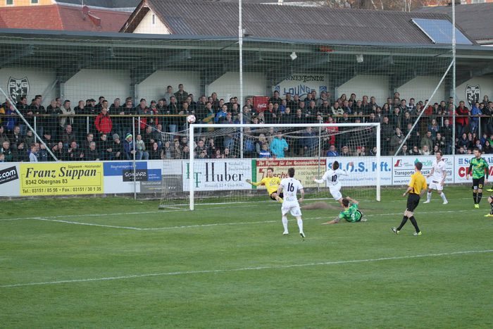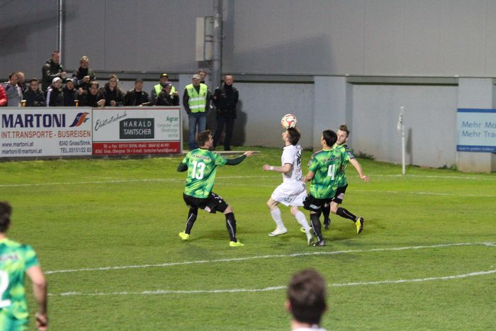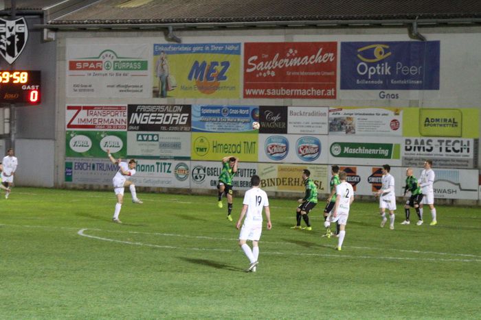 Bereits in der 1. Minute köpfelt Gnas-Kapitän Christoph Haas einen Eckball am Tor vorbei.