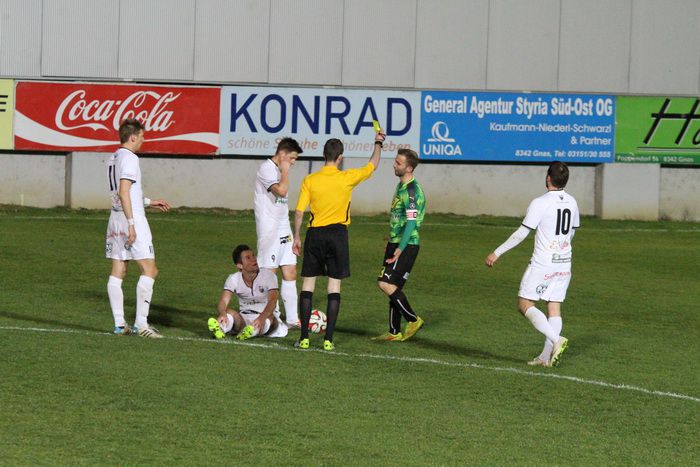 Gleisdorf-Kapitän Deutschmann sieht nach Foul an Strohmaier die gelbe Karte.