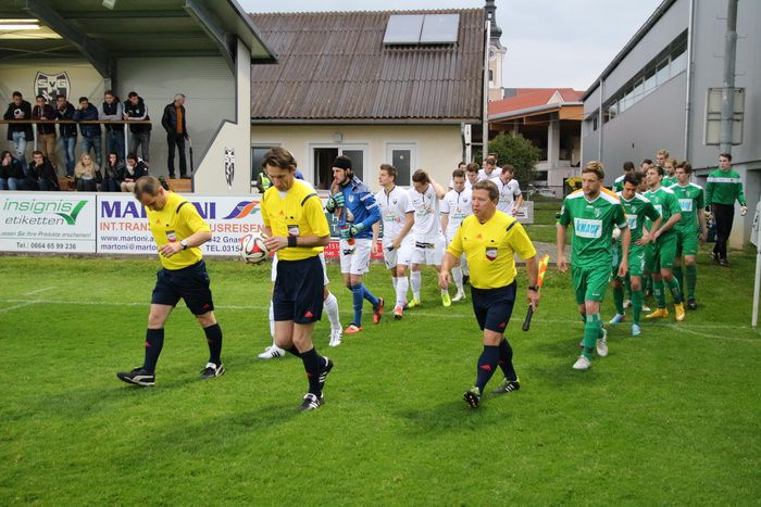 Das Schiedsrichterteam um SR Wolfgang Pucher führt die Mannschaften aufs Spielfeld.